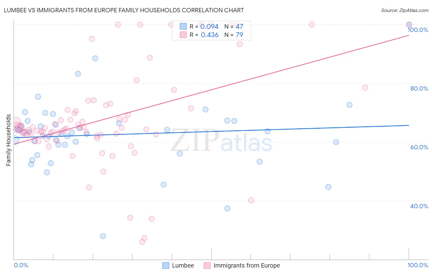 Lumbee vs Immigrants from Europe Family Households Correlation Chart