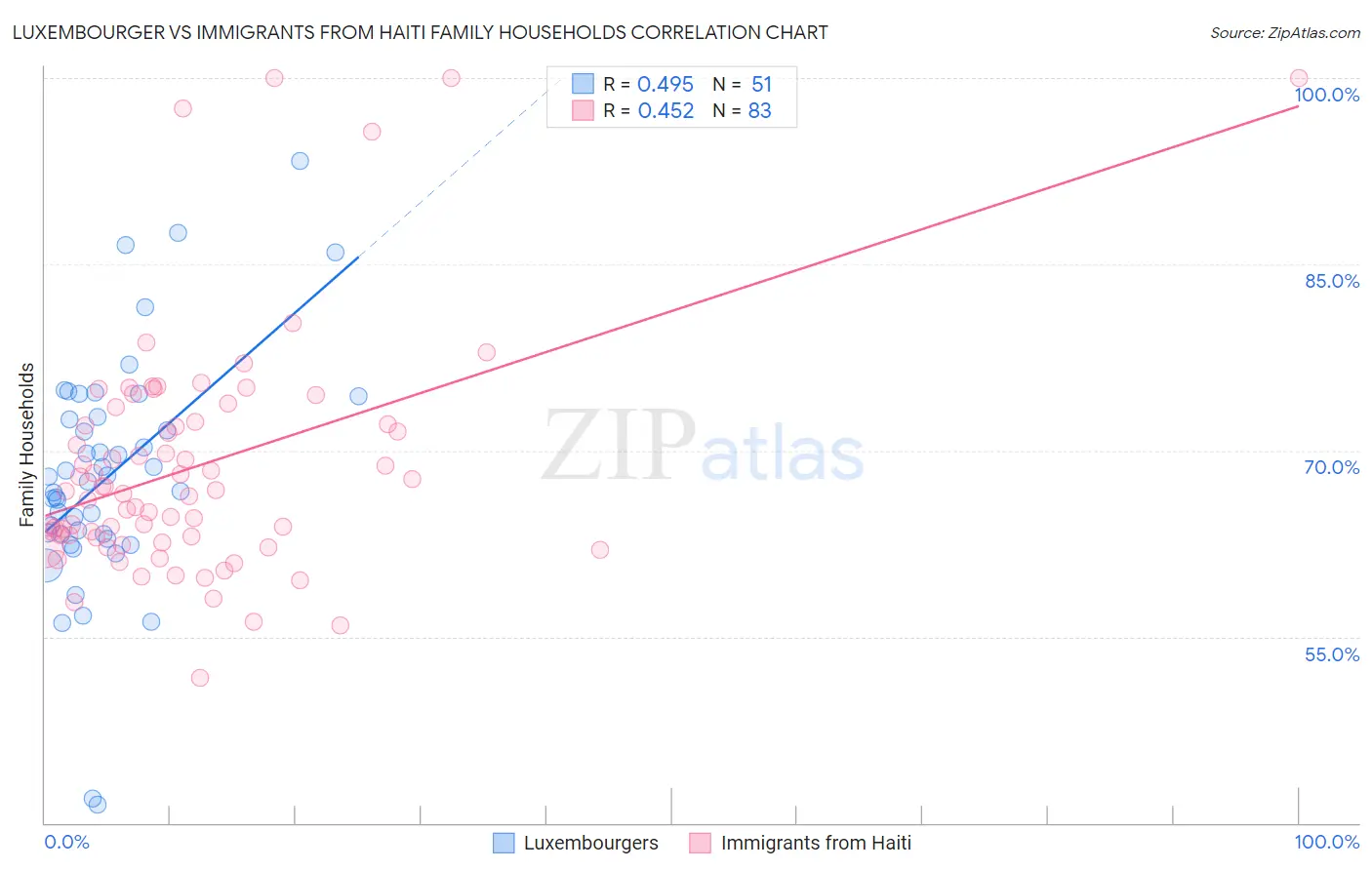 Luxembourger vs Immigrants from Haiti Family Households Correlation Chart