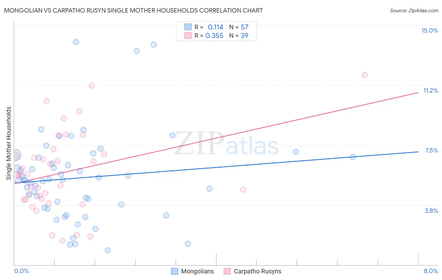 The statistical analysis conducted on geographies consisting of 140,225,354 people shows a poor positive correlation between the proportion of Mongolians and percentage of single mother households in the United States with a correlation coefficient (R) of 0.114 and weighted average of 5.8%. Similarly, the statistical analysis conducted on geographies consisting of 58,858,752 people shows a mild positive correlation between the proportion of Carpatho Rusyns and percentage of single mother households in the United States with a correlation coefficient (R) of 0.355 and weighted average of 5.7%, a difference of 2.2%.