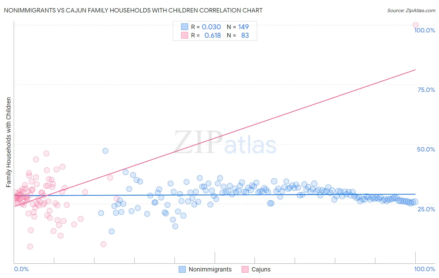 The statistical analysis conducted on geographies consisting of 583,873,030 people shows no correlation between the proportion of Nonimmigrants and percentage of family households with children in the United States with a correlation coefficient (R) of 0.030 and weighted average of 27.5%. Similarly, the statistical analysis conducted on geographies consisting of 149,693,835 people shows a significant positive correlation between the proportion of Cajuns and percentage of family households with children in the United States with a correlation coefficient (R) of 0.618 and weighted average of 27.7%, a difference of 0.82%.