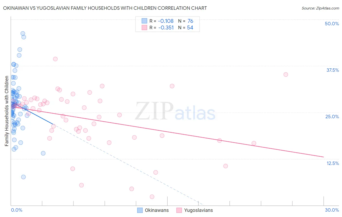 The statistical analysis conducted on geographies consisting of 73,692,255 people shows a poor negative correlation between the proportion of Okinawans and percentage of family households with children in the United States with a correlation coefficient (R) of -0.108 and weighted average of 27.2%. Similarly, the statistical analysis conducted on geographies consisting of 285,532,788 people shows a mild negative correlation between the proportion of Yugoslavians and percentage of family households with children in the United States with a correlation coefficient (R) of -0.351 and weighted average of 27.0%, a difference of 0.61%.