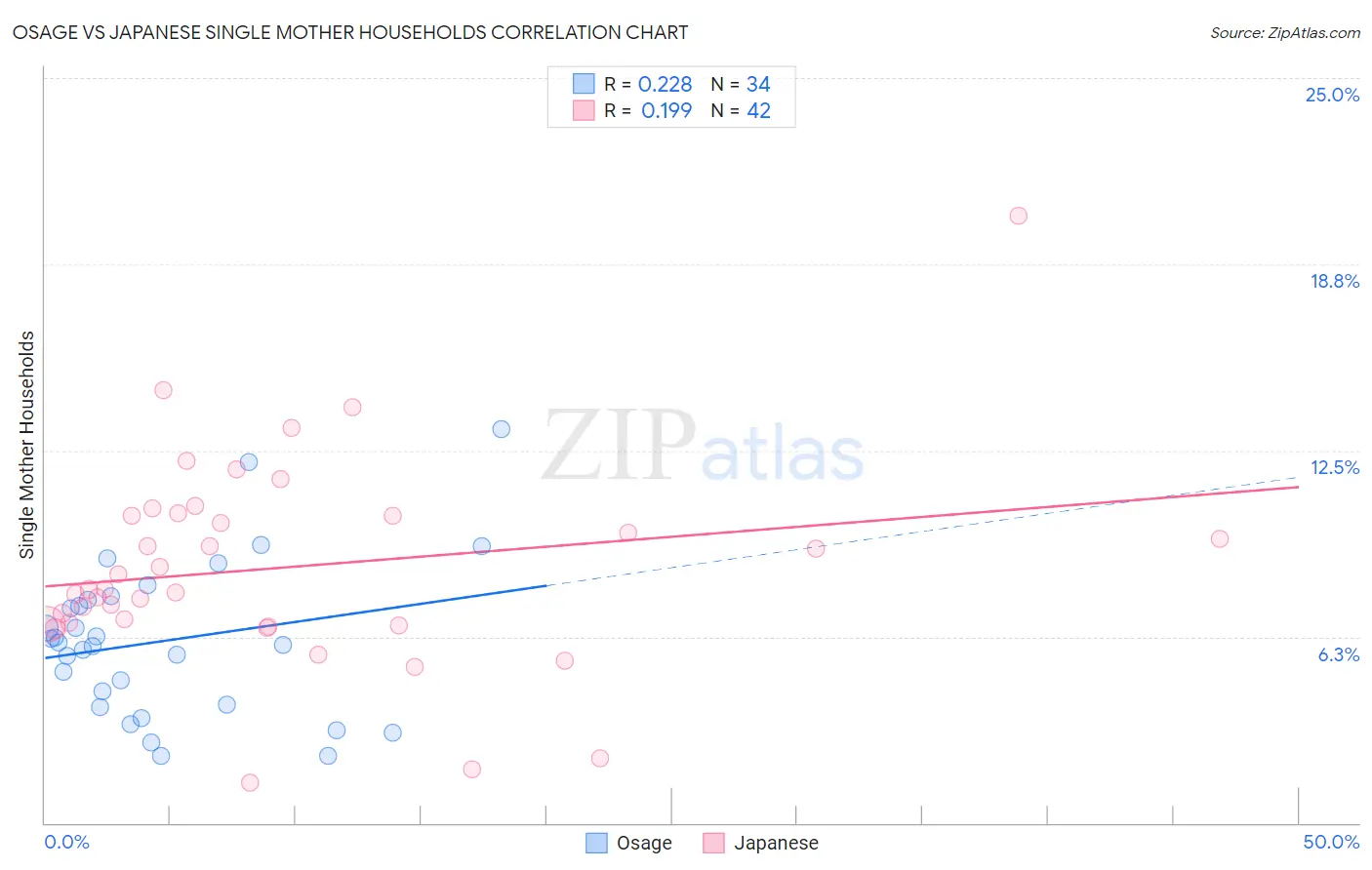 The statistical analysis conducted on geographies consisting of 91,762,553 people shows a weak positive correlation between the proportion of Osage and percentage of single mother households in the United States with a correlation coefficient (R) of 0.228 and weighted average of 6.4%. Similarly, the statistical analysis conducted on geographies consisting of 248,925,725 people shows a poor positive correlation between the proportion of Japanese and percentage of single mother households in the United States with a correlation coefficient (R) of 0.199 and weighted average of 7.4%, a difference of 16.4%.