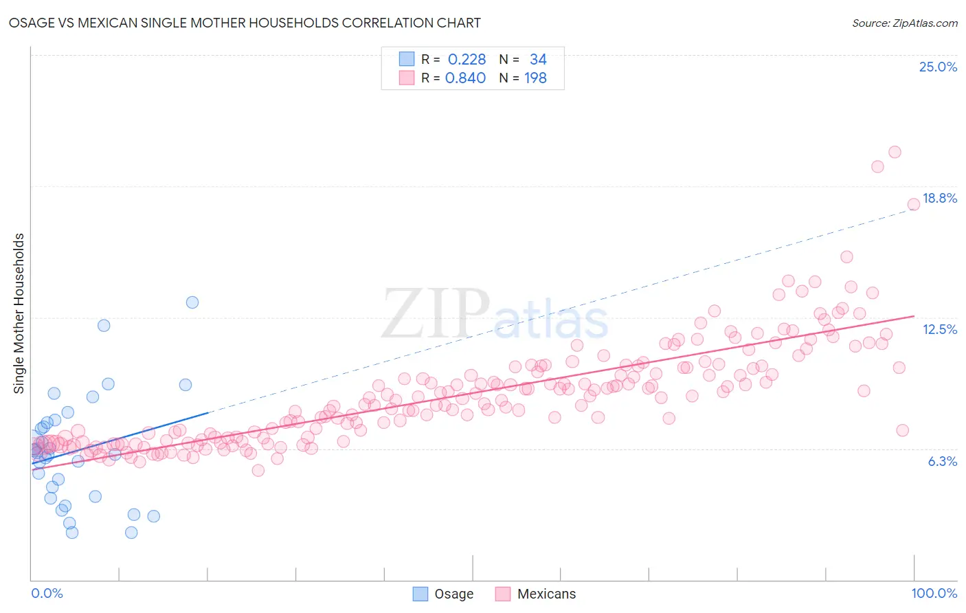 The statistical analysis conducted on geographies consisting of 91,762,553 people shows a weak positive correlation between the proportion of Osage and percentage of single mother households in the United States with a correlation coefficient (R) of 0.228 and weighted average of 6.4%. Similarly, the statistical analysis conducted on geographies consisting of 560,737,784 people shows a very strong positive correlation between the proportion of Mexicans and percentage of single mother households in the United States with a correlation coefficient (R) of 0.840 and weighted average of 8.0%, a difference of 25.2%.