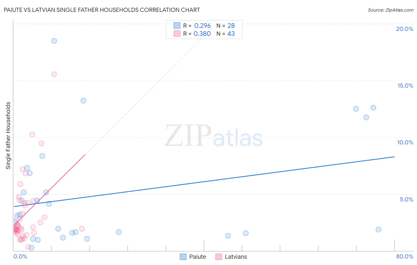 The statistical analysis conducted on geographies consisting of 58,300,881 people shows a weak positive correlation between the proportion of Paiute and percentage of single father households in the United States with a correlation coefficient (R) of 0.296 and weighted average of 3.3%. Similarly, the statistical analysis conducted on geographies consisting of 219,307,286 people shows a mild positive correlation between the proportion of Latvians and percentage of single father households in the United States with a correlation coefficient (R) of 0.380 and weighted average of 2.0%, a difference of 64.4%.
