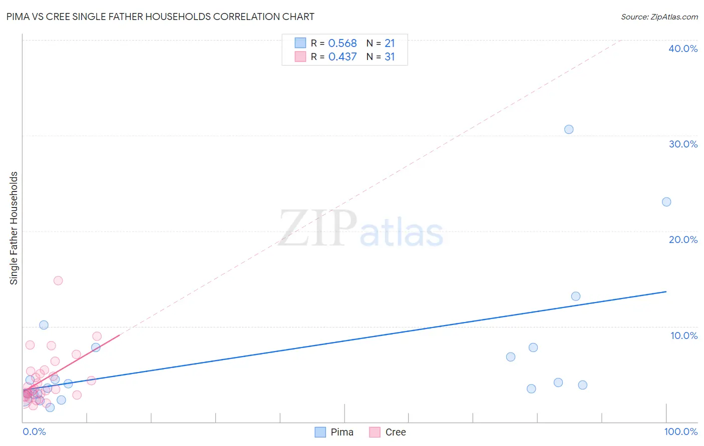 The statistical analysis conducted on geographies consisting of 61,336,251 people shows a substantial positive correlation between the proportion of Pima and percentage of single father households in the United States with a correlation coefficient (R) of 0.568 and weighted average of 4.2%. Similarly, the statistical analysis conducted on geographies consisting of 76,112,534 people shows a moderate positive correlation between the proportion of Cree and percentage of single father households in the United States with a correlation coefficient (R) of 0.437 and weighted average of 2.8%, a difference of 50.8%.