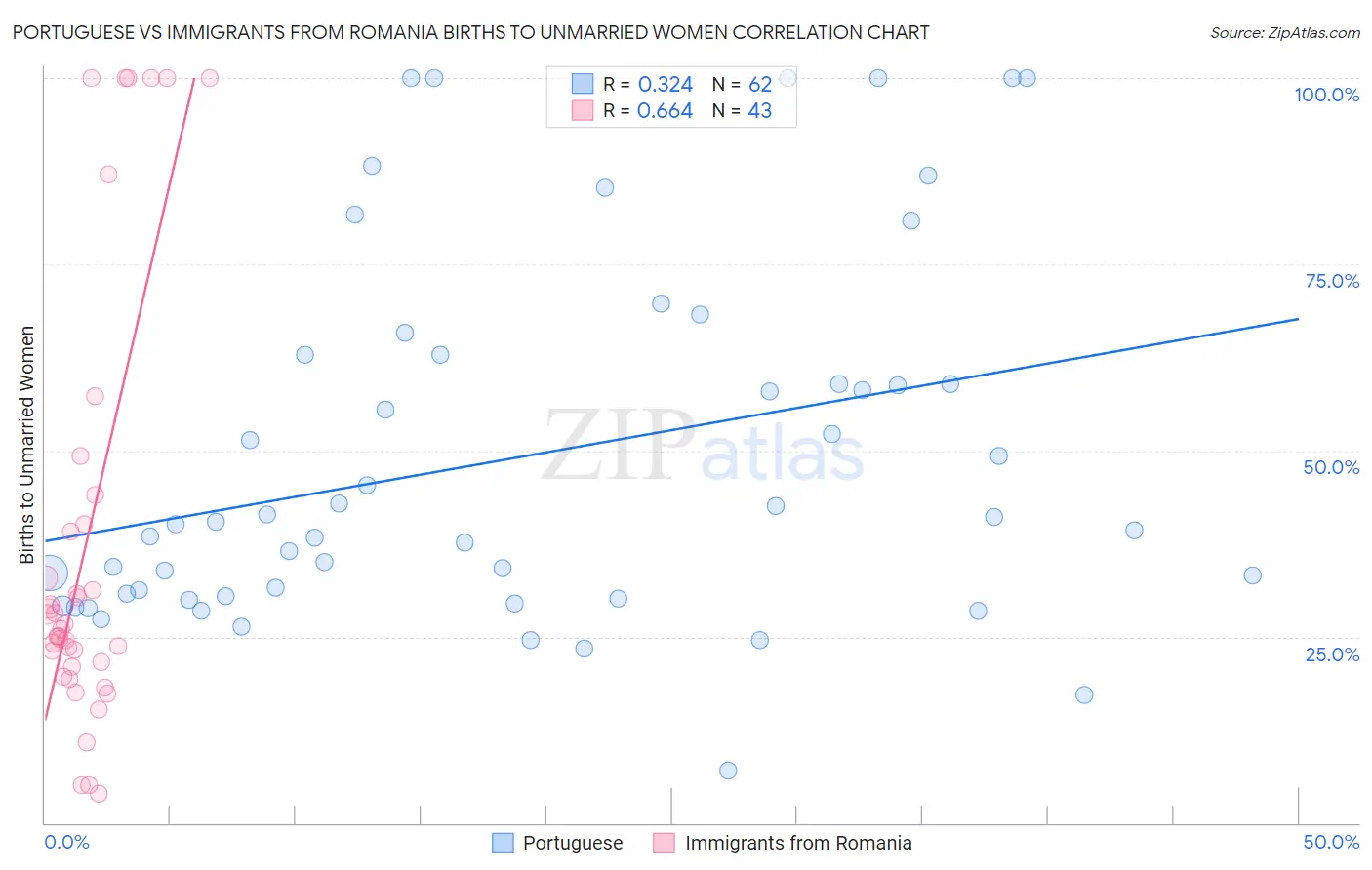 Portuguese vs Immigrants from Romania Births to Unmarried Women Correlation Chart