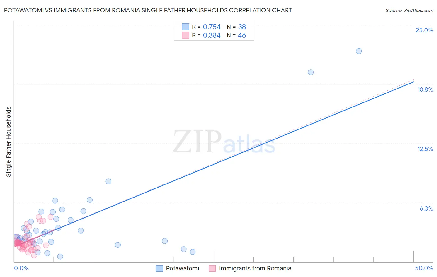 Potawatomi vs Immigrants from Romania Single Father Households Correlation Chart