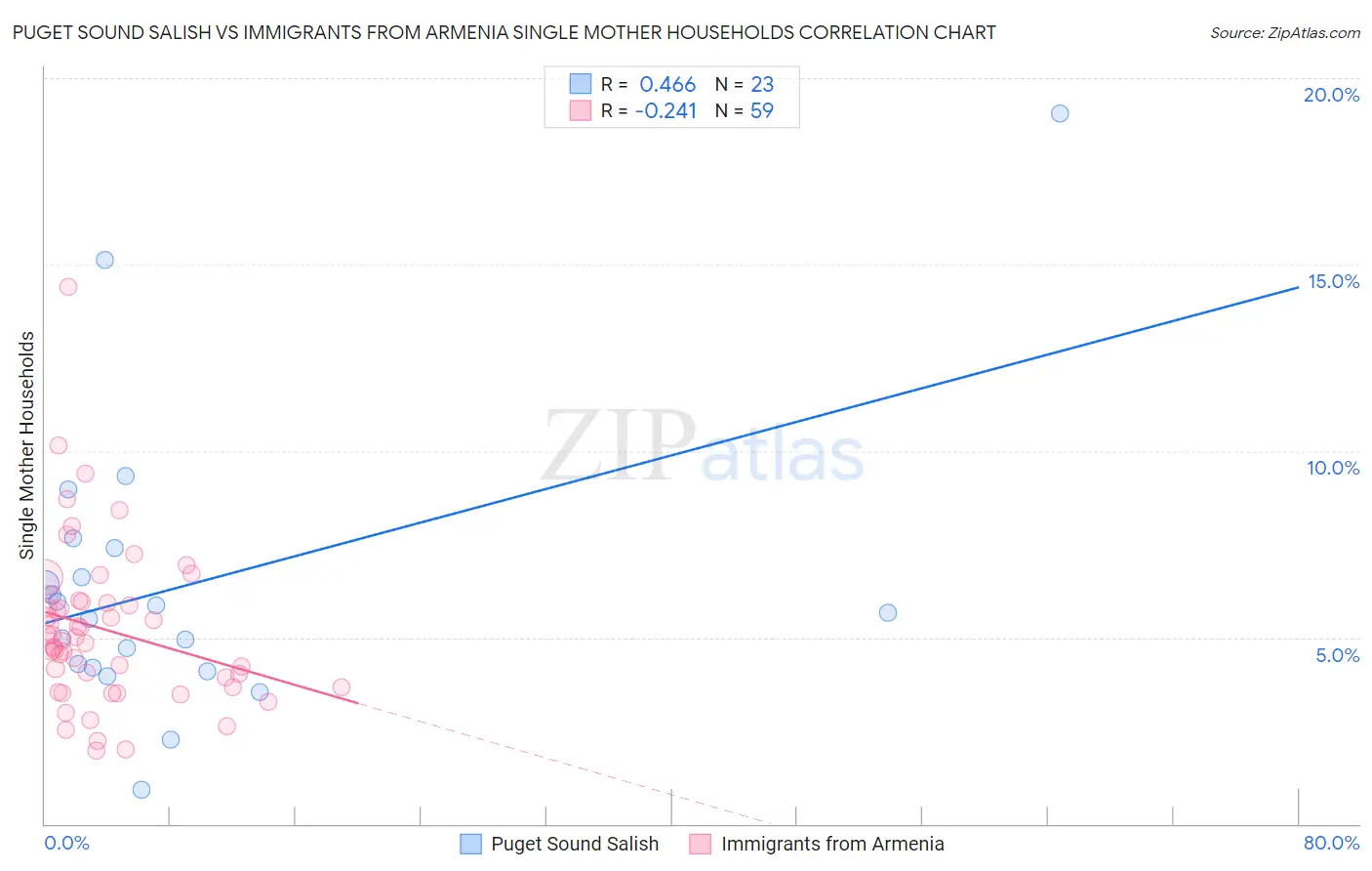 Puget Sound Salish vs Immigrants from Armenia Single Mother Households Correlation Chart