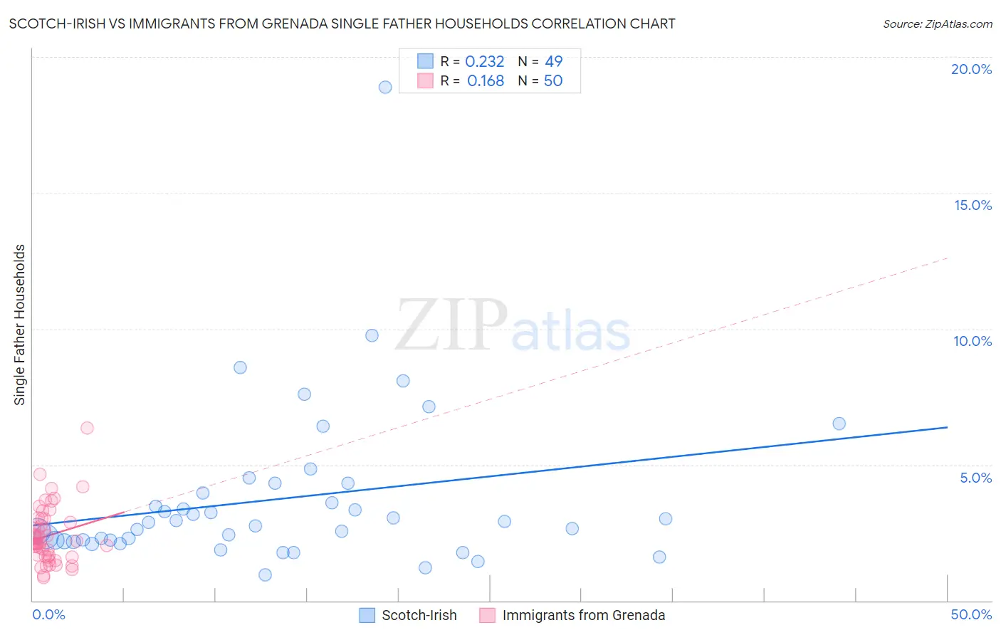 Scotch-Irish vs Immigrants from Grenada Single Father Households Correlation Chart