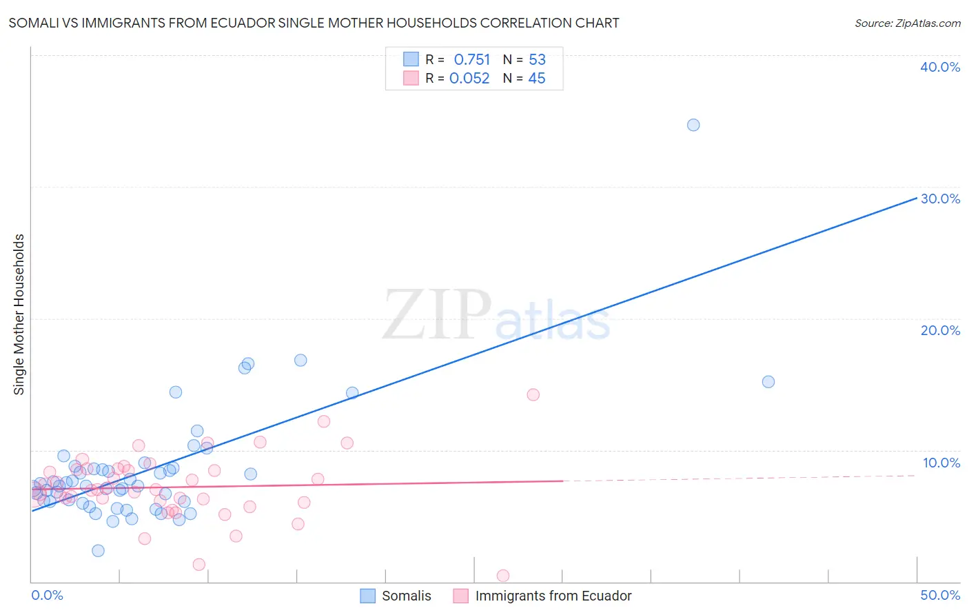 Somali vs Immigrants from Ecuador Single Mother Households Correlation Chart