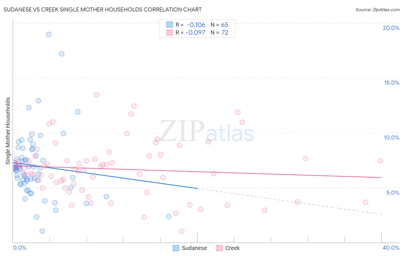 Sudanese vs Creek Single Mother Households Correlation Chart