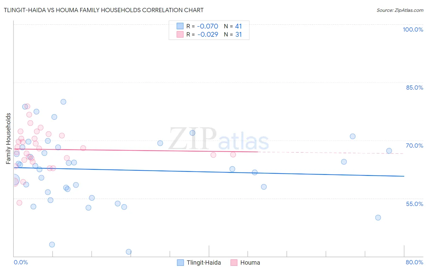 Tlingit-Haida vs Houma Family Households Correlation Chart