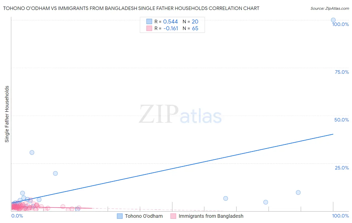 Tohono O'odham vs Immigrants from Bangladesh Single Father Households Correlation Chart
