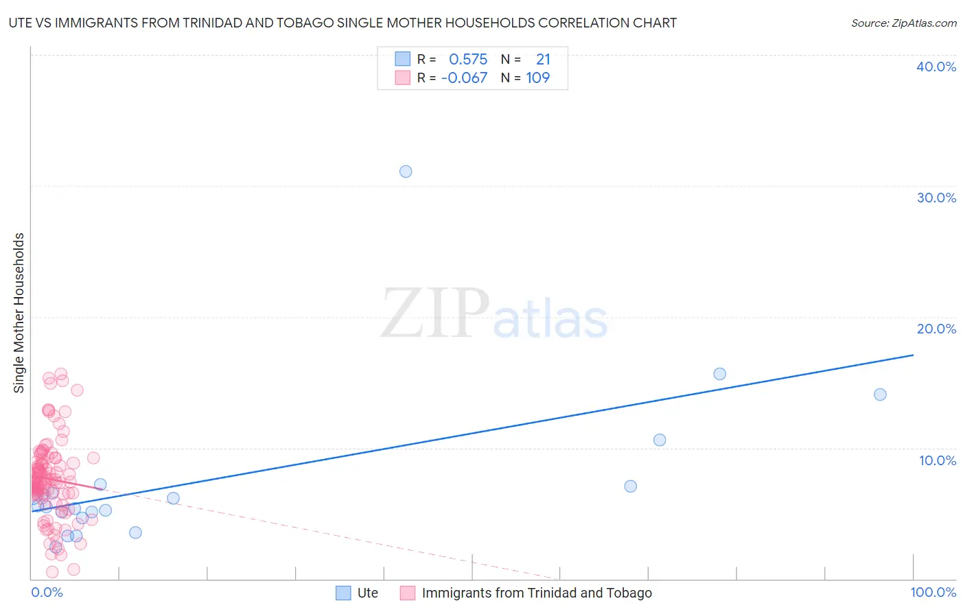 Ute vs Immigrants from Trinidad and Tobago Single Mother Households Correlation Chart