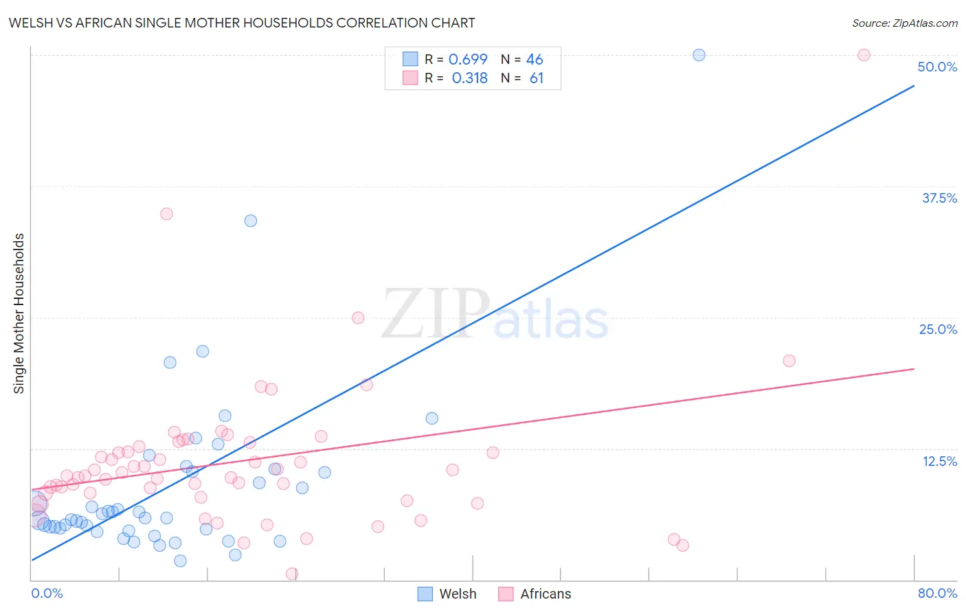 The statistical analysis conducted on geographies consisting of 524,967,910 people shows a significant positive correlation between the proportion of Welsh and percentage of single mother households in the United States with a correlation coefficient (R) of 0.699 and weighted average of 5.9%. Similarly, the statistical analysis conducted on geographies consisting of 468,558,446 people shows a mild positive correlation between the proportion of Africans and percentage of single mother households in the United States with a correlation coefficient (R) of 0.318 and weighted average of 8.2%, a difference of 39.3%.