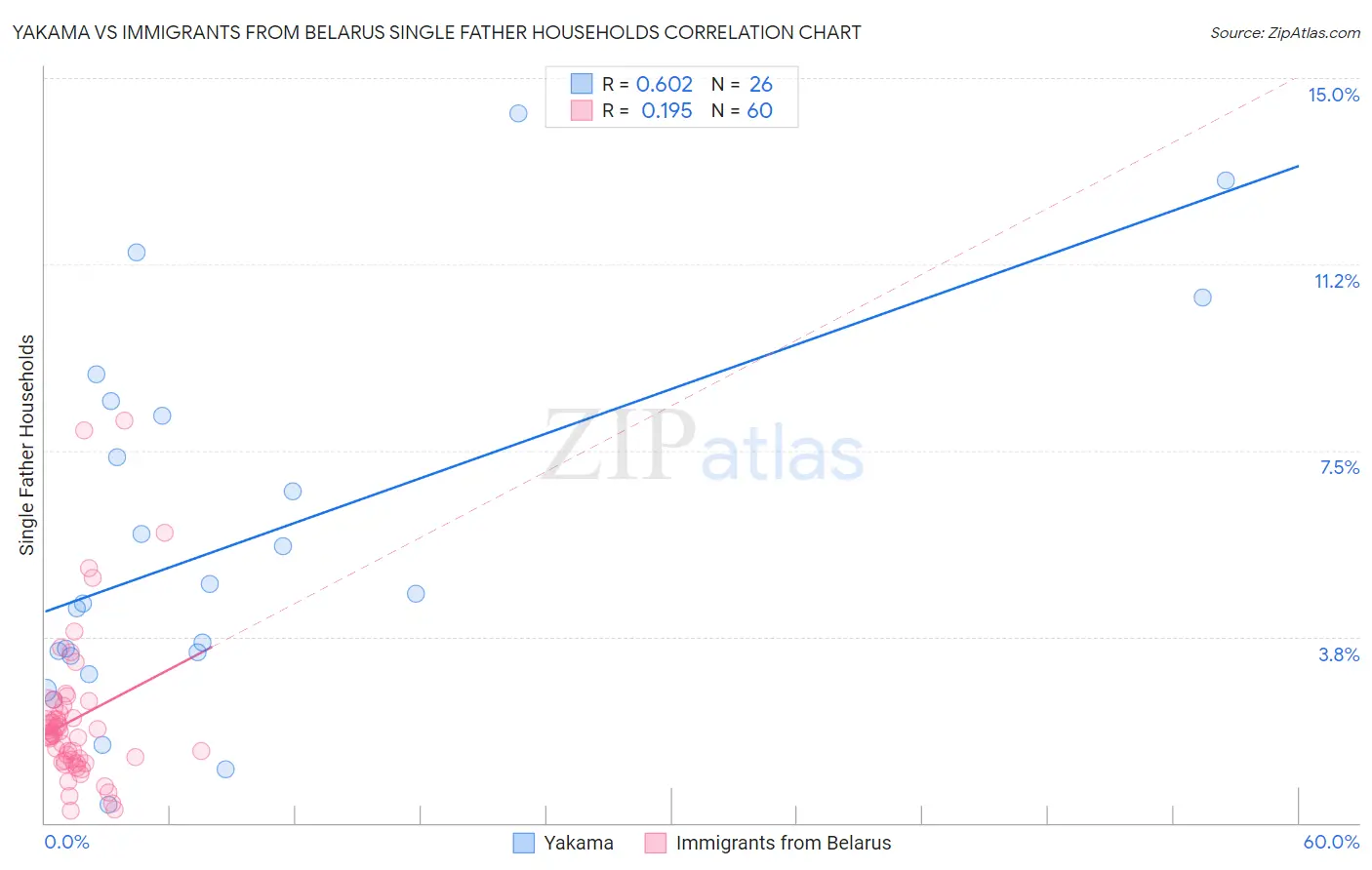 Yakama vs Immigrants from Belarus Single Father Households Correlation Chart