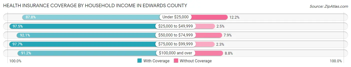 As of the 2010 census, the population of Edwards County was 6,721. The population is largely white (96.2%), with small percentages of African American (1.7%), Native American (0.3%), Asian (0.2%), and other races (1.6%). The median household income is $41,945, and the median family income is $50,945. The per capita income is $20,945. The unemployment rate is 6.2%.
