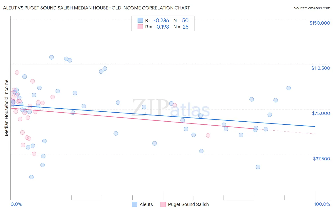 Aleut vs Puget Sound Salish Median Household Income Correlation Chart