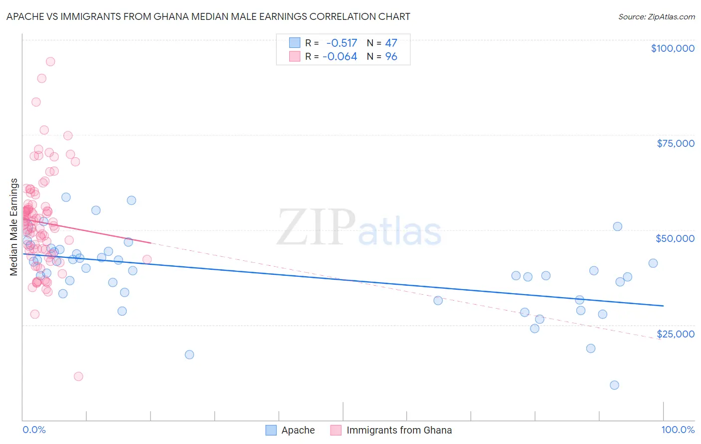 Apache vs Immigrants from Ghana Median Male Earnings Correlation Chart