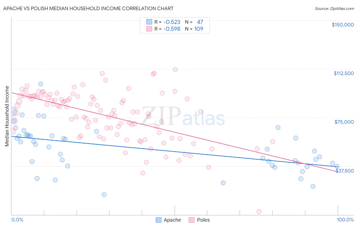 The statistical analysis conducted on geographies consisting of 230,997,736 people shows a substantial negative correlation between the proportion of Apache and median household income in the United States with a correlation coefficient (R) of -0.523 and weighted average of $70,927. Similarly, the statistical analysis conducted on geographies consisting of 559,571,407 people shows a substantial negative correlation between the proportion of Poles and median household income in the United States with a correlation coefficient (R) of -0.598 and weighted average of $88,472, a difference of 24.7%.