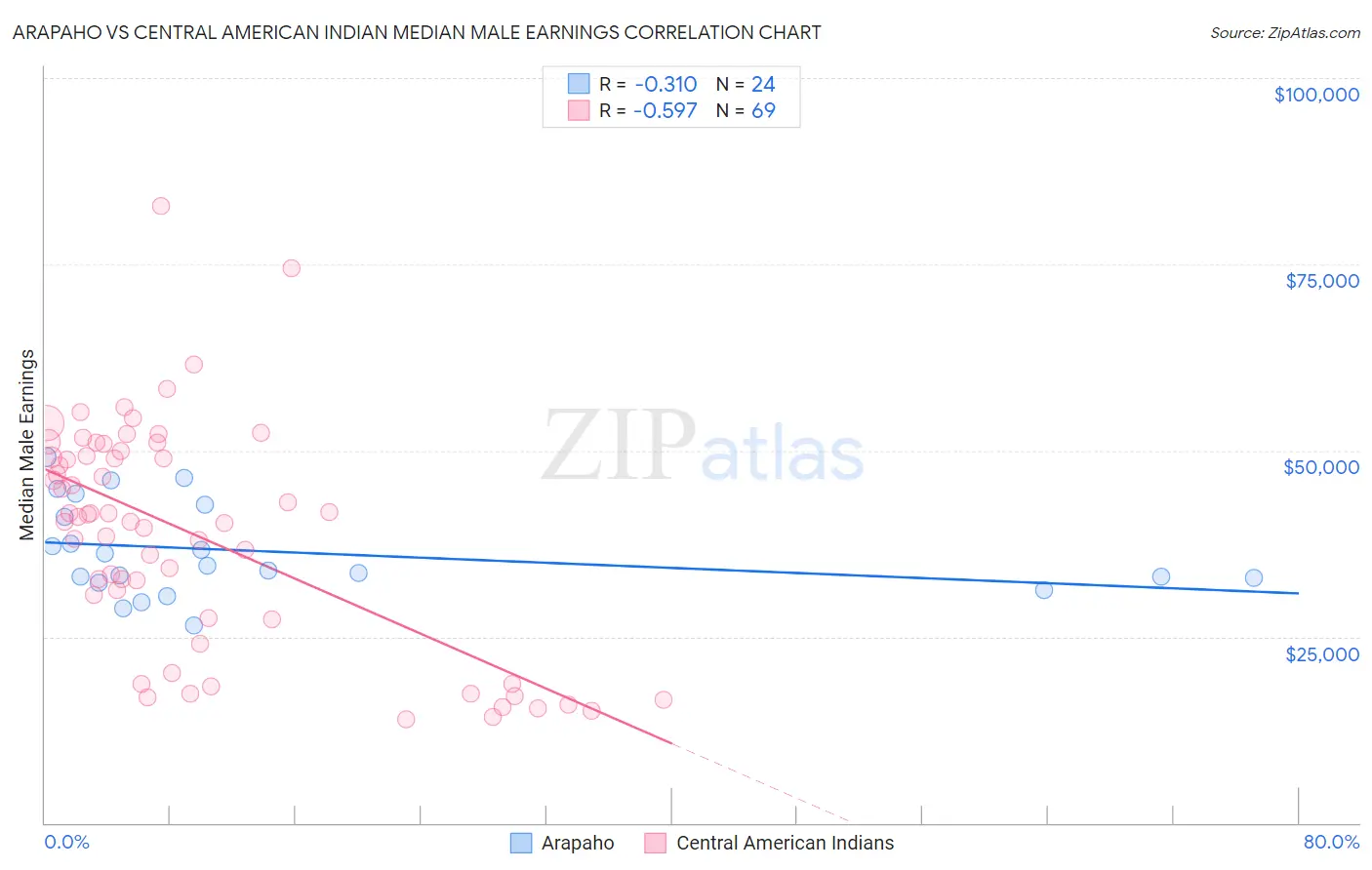 Arapaho vs Central American Indian Median Male Earnings Correlation Chart