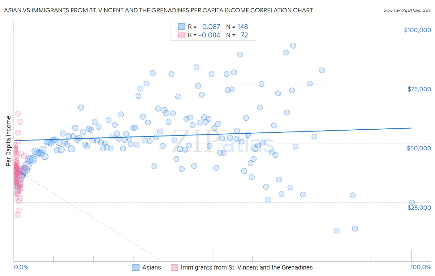 Asian vs Immigrants from St. Vincent and the Grenadines Per Capita Income Correlation Chart