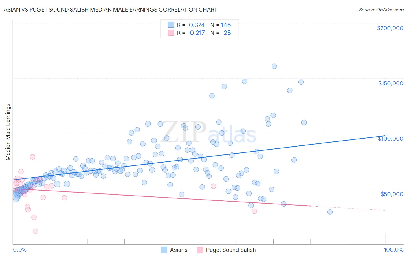 Asian vs Puget Sound Salish Median Male Earnings Correlation Chart