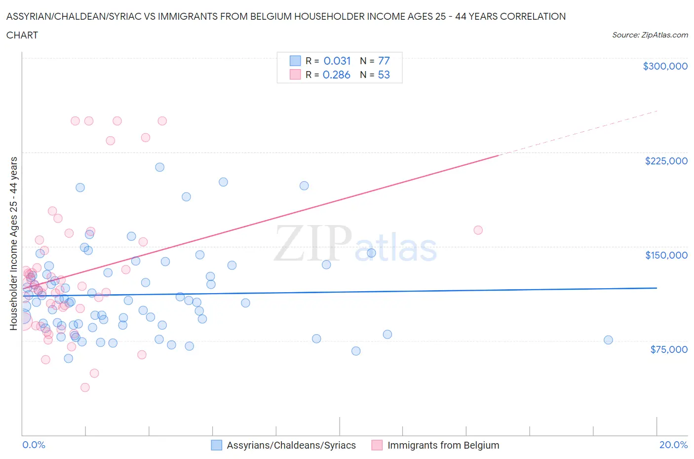 Assyrian/Chaldean/Syriac vs Immigrants from Belgium Householder Income Ages 25 - 44 years Correlation Chart