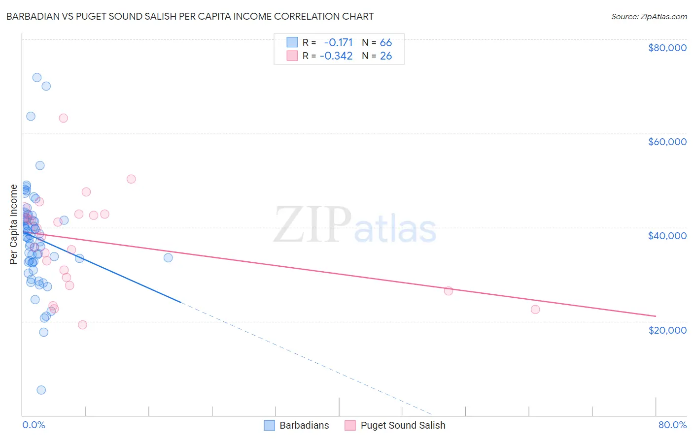 Barbadian vs Puget Sound Salish Per Capita Income Correlation Chart