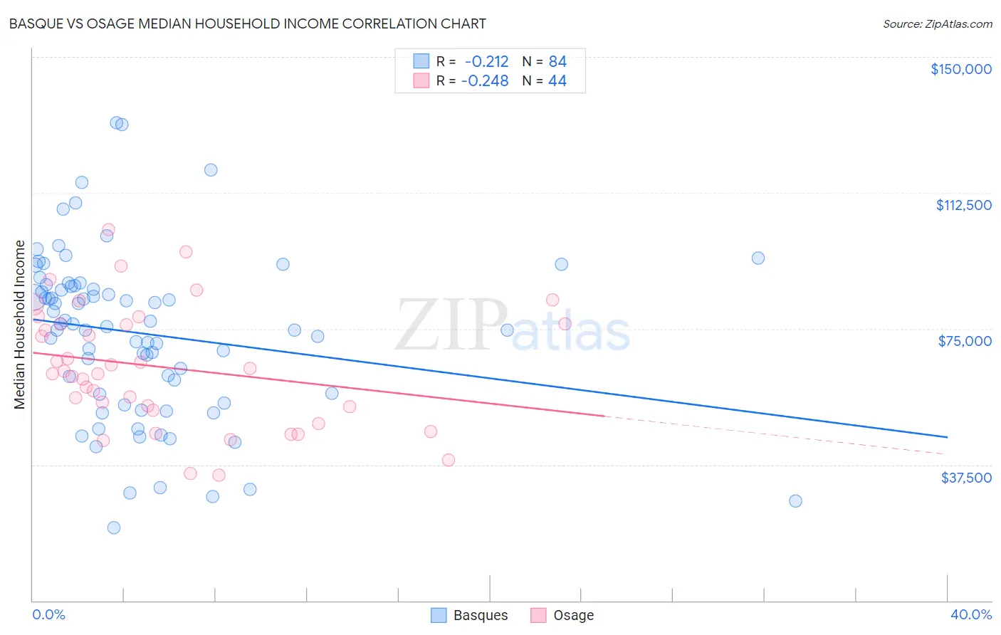 The statistical analysis conducted on geographies consisting of 165,746,357 people shows a weak negative correlation between the proportion of Basques and median household income in the United States with a correlation coefficient (R) of -0.212 and weighted average of $87,001. Similarly, the statistical analysis conducted on geographies consisting of 91,796,475 people shows a weak negative correlation between the proportion of Osage and median household income in the United States with a correlation coefficient (R) of -0.248 and weighted average of $75,240, a difference of 15.6%.
