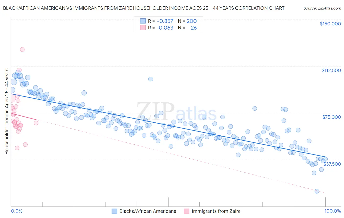 Black/African American vs Immigrants from Zaire Householder Income Ages 25 - 44 years Correlation Chart