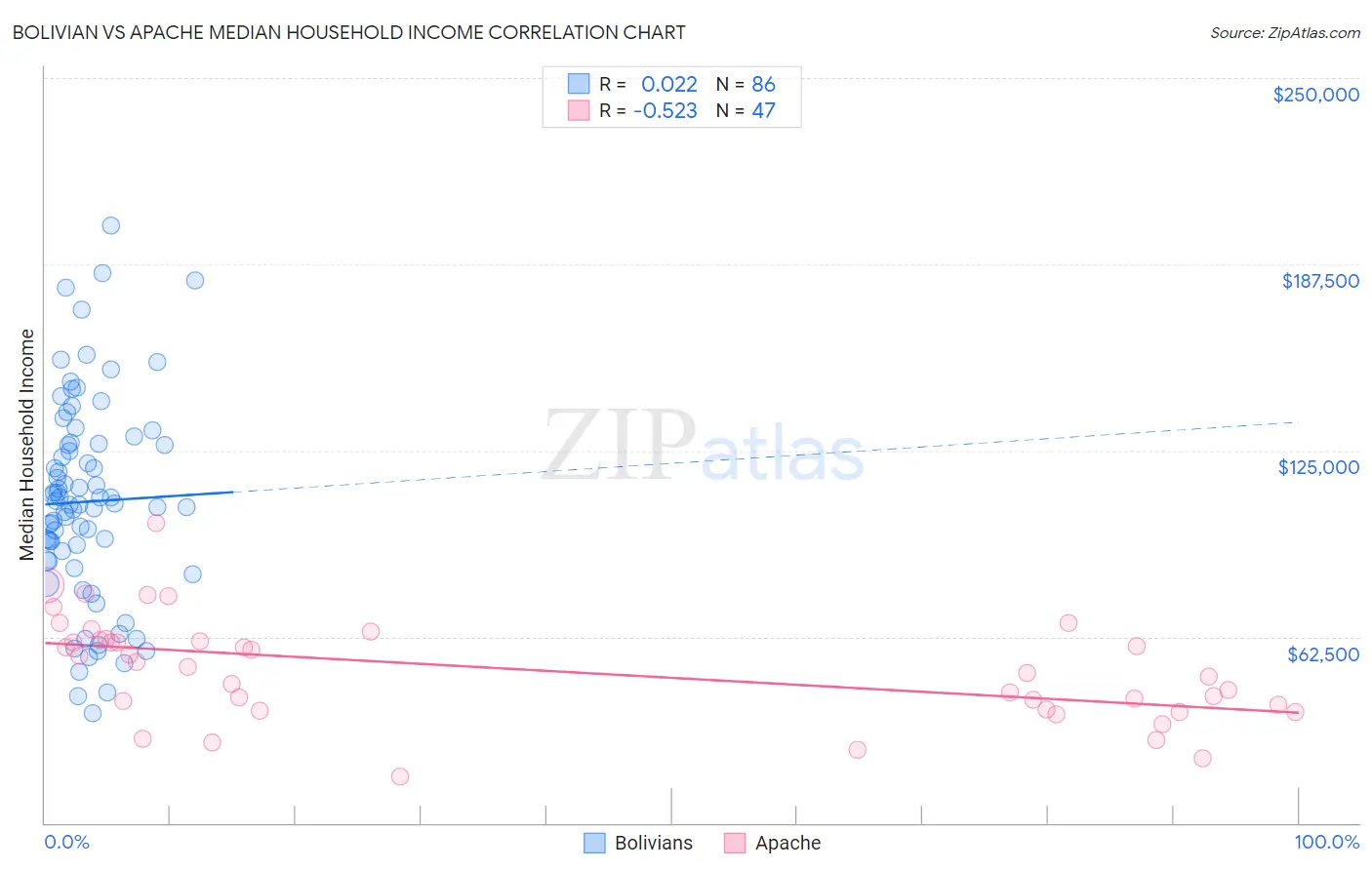Bolivian vs Apache Median Household Income Correlation Chart