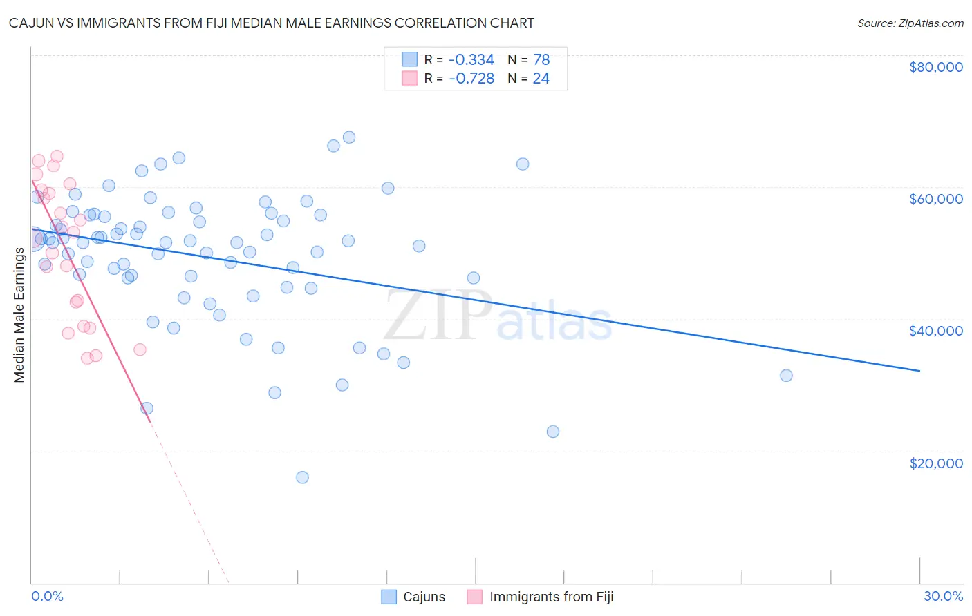Cajun vs Immigrants from Fiji Median Male Earnings Correlation Chart