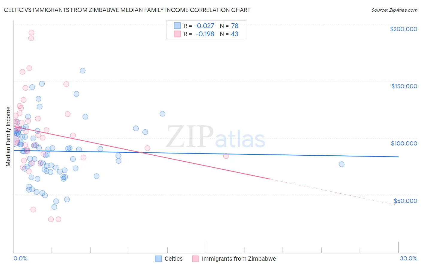 Celtic vs Immigrants from Zimbabwe Median Family Income Correlation Chart
