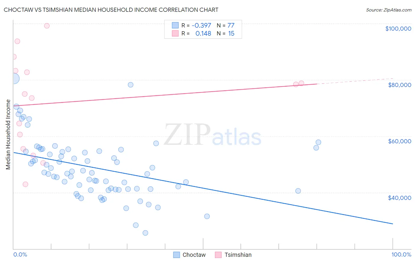 Choctaw vs Tsimshian Median Household Income Correlation Chart