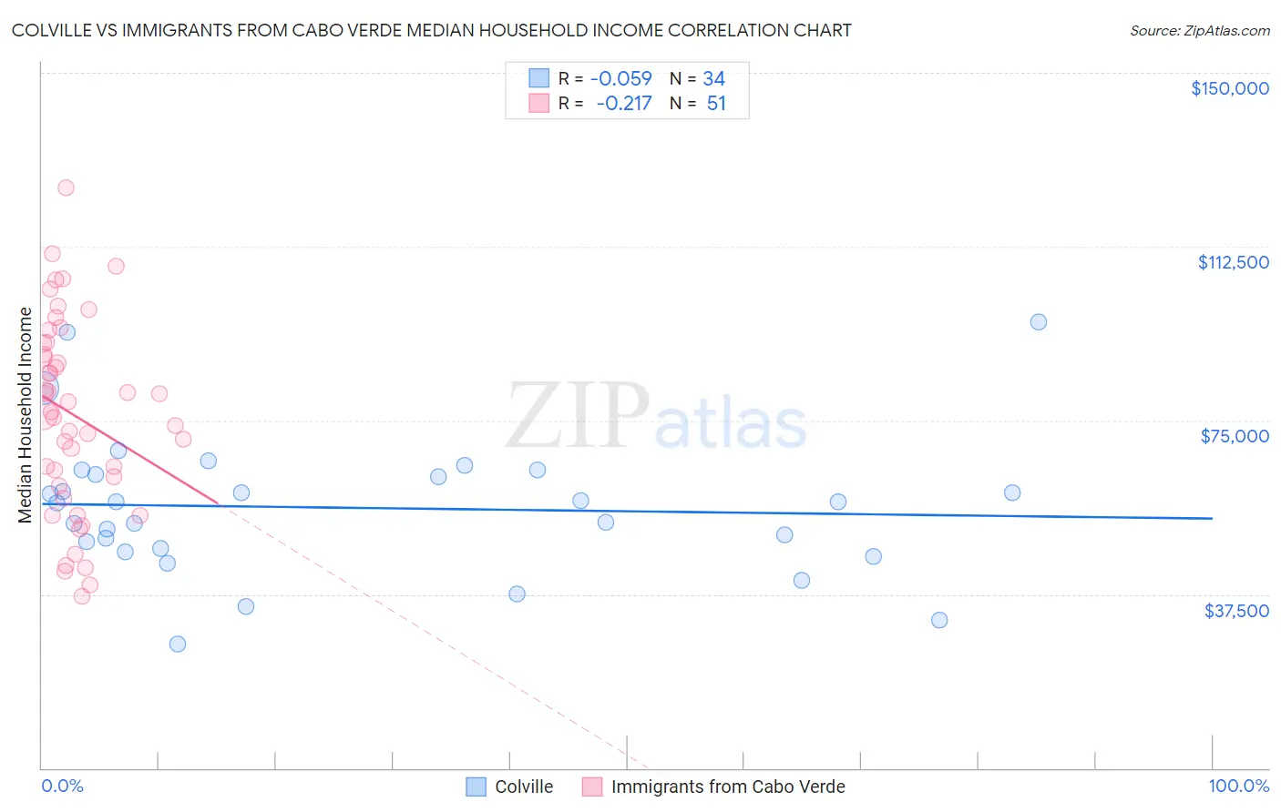 Colville vs Immigrants from Cabo Verde Median Household Income Correlation Chart