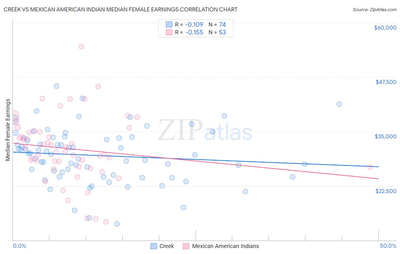 Creek vs Mexican American Indian Median Female Earnings Correlation Chart