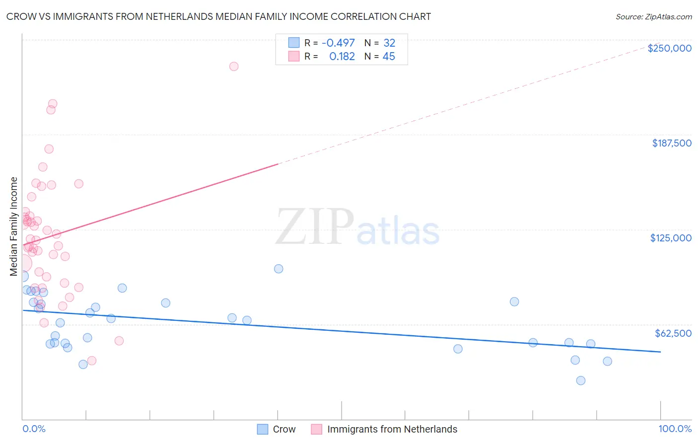 Crow vs Immigrants from Netherlands Median Family Income Correlation Chart