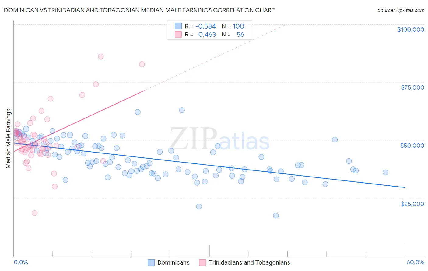 Dominican vs Trinidadian and Tobagonian Median Male Earnings Correlation Chart