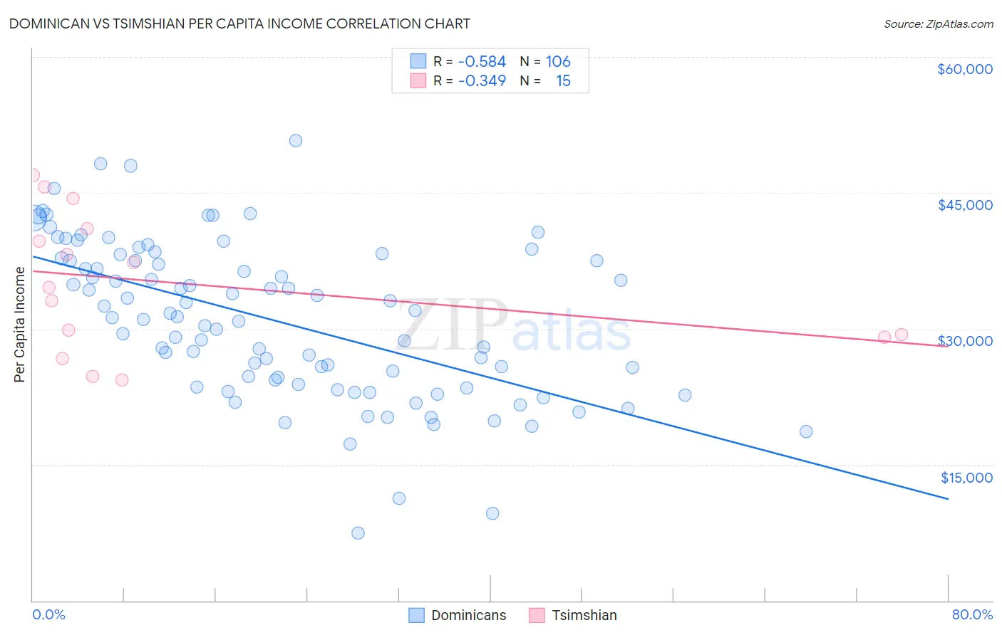 Dominican vs Tsimshian Per Capita Income Correlation Chart