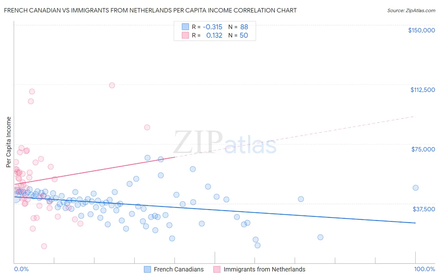 French Canadian vs Immigrants from Netherlands Per Capita Income Correlation Chart