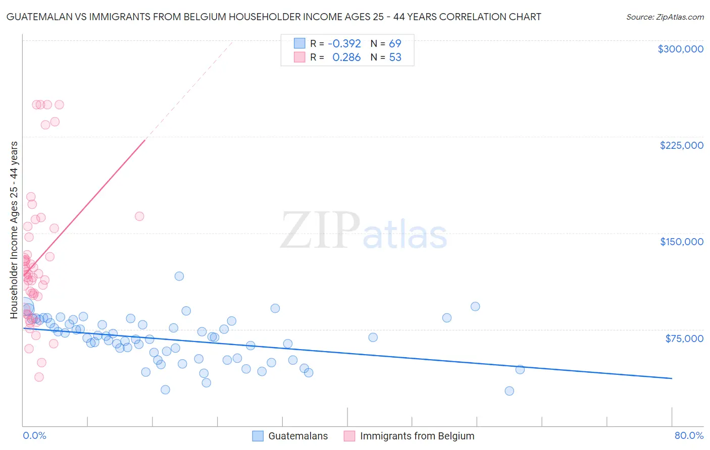 Guatemalan vs Immigrants from Belgium Householder Income Ages 25 - 44 years Correlation Chart