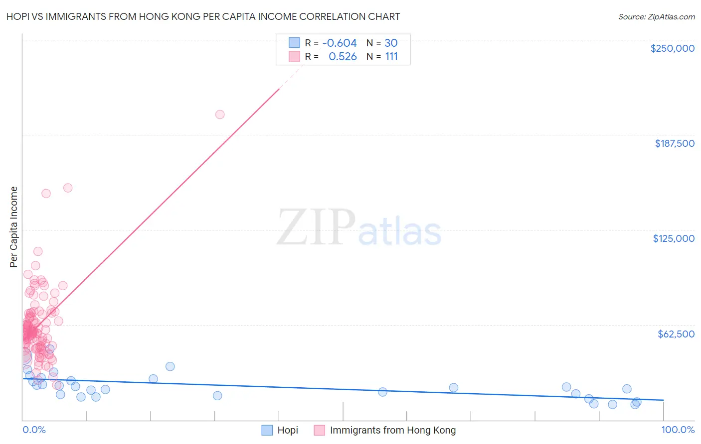 Hopi vs Immigrants from Hong Kong Per Capita Income Correlation Chart