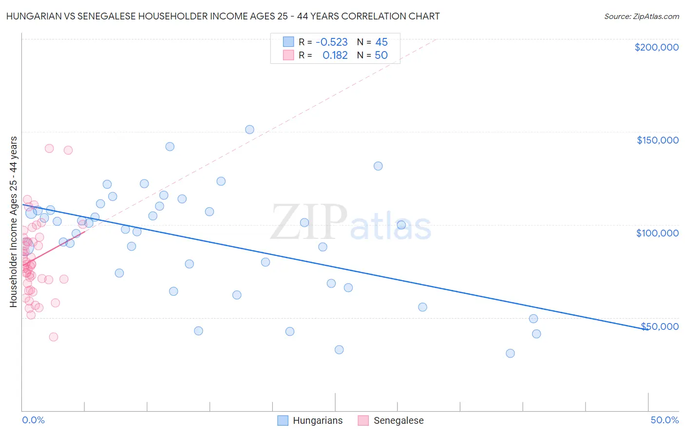 Hungarian vs Senegalese Householder Income Ages 25 - 44 years Correlation Chart