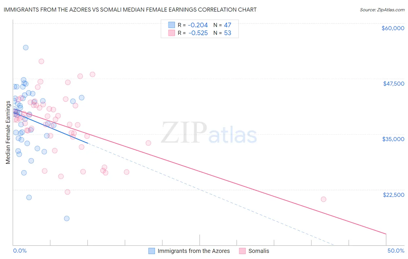 Immigrants from the Azores vs Somali Median Female Earnings Correlation Chart