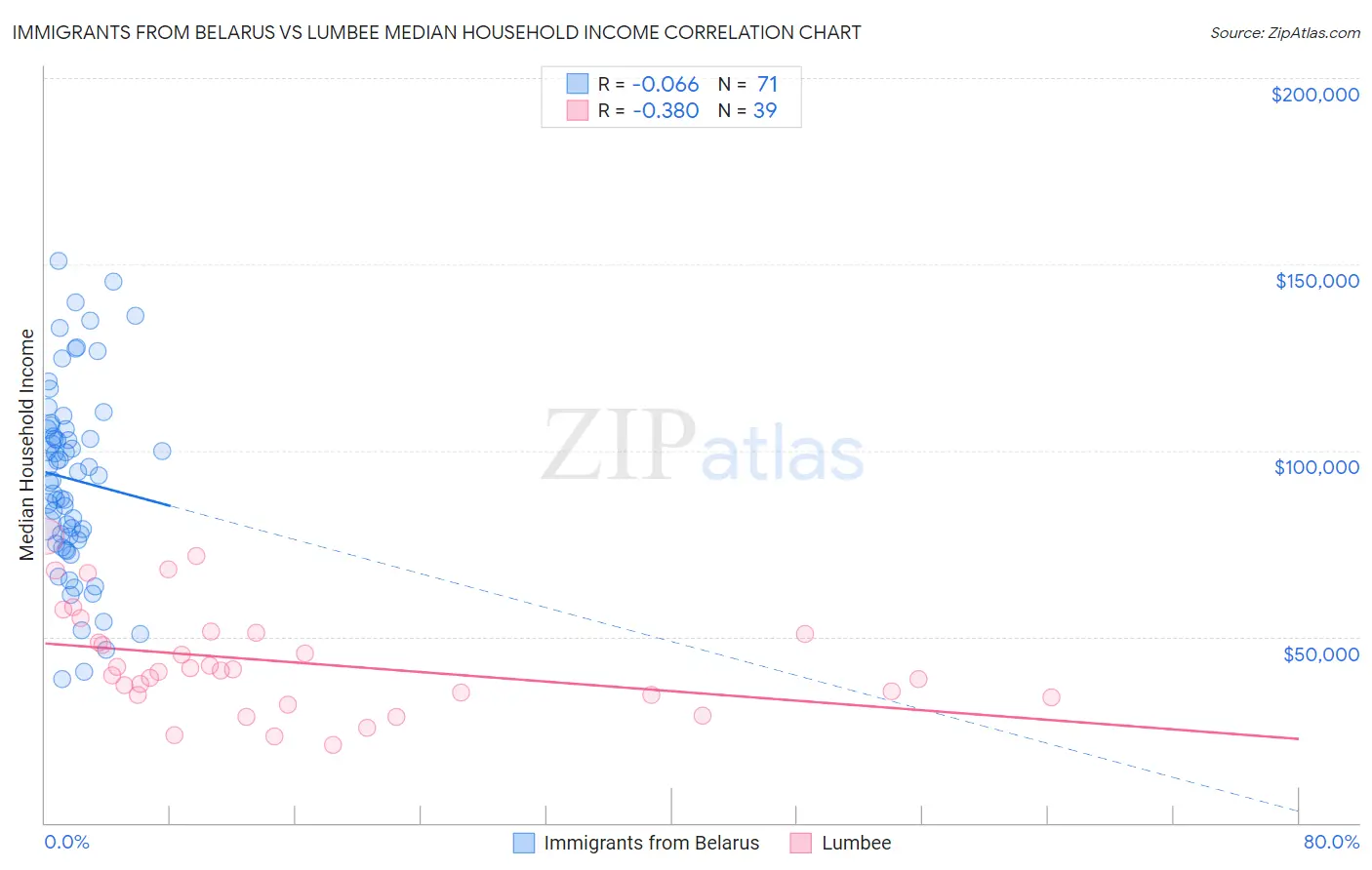 Immigrants from Belarus vs Lumbee Median Household Income Correlation Chart