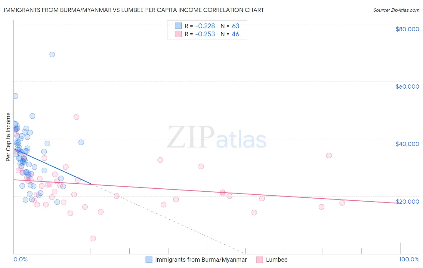 Immigrants from Burma/Myanmar vs Lumbee Per Capita Income Correlation Chart
