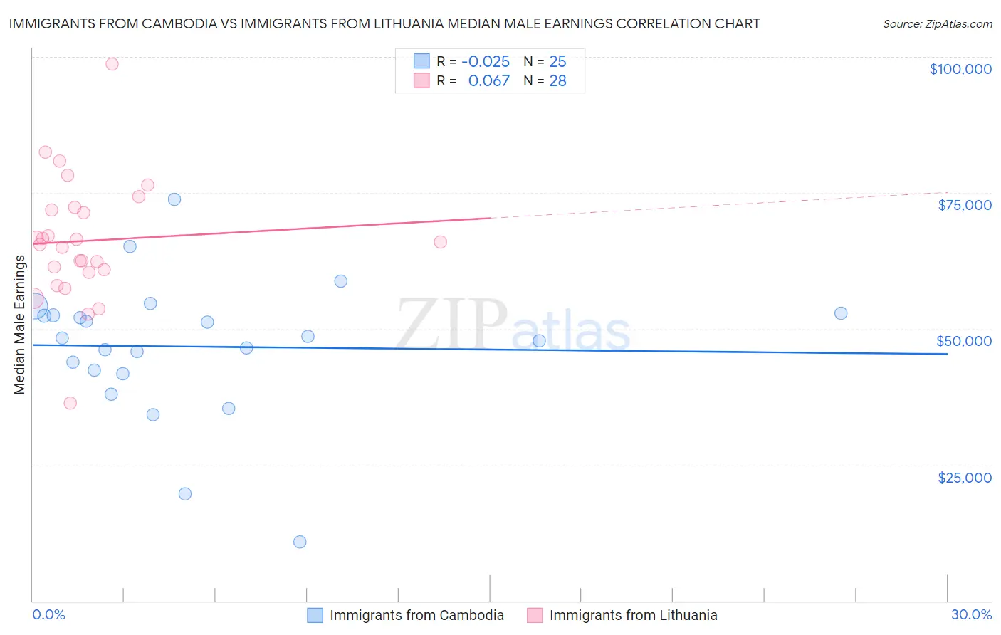 Immigrants from Cambodia vs Immigrants from Lithuania Median Male Earnings Correlation Chart