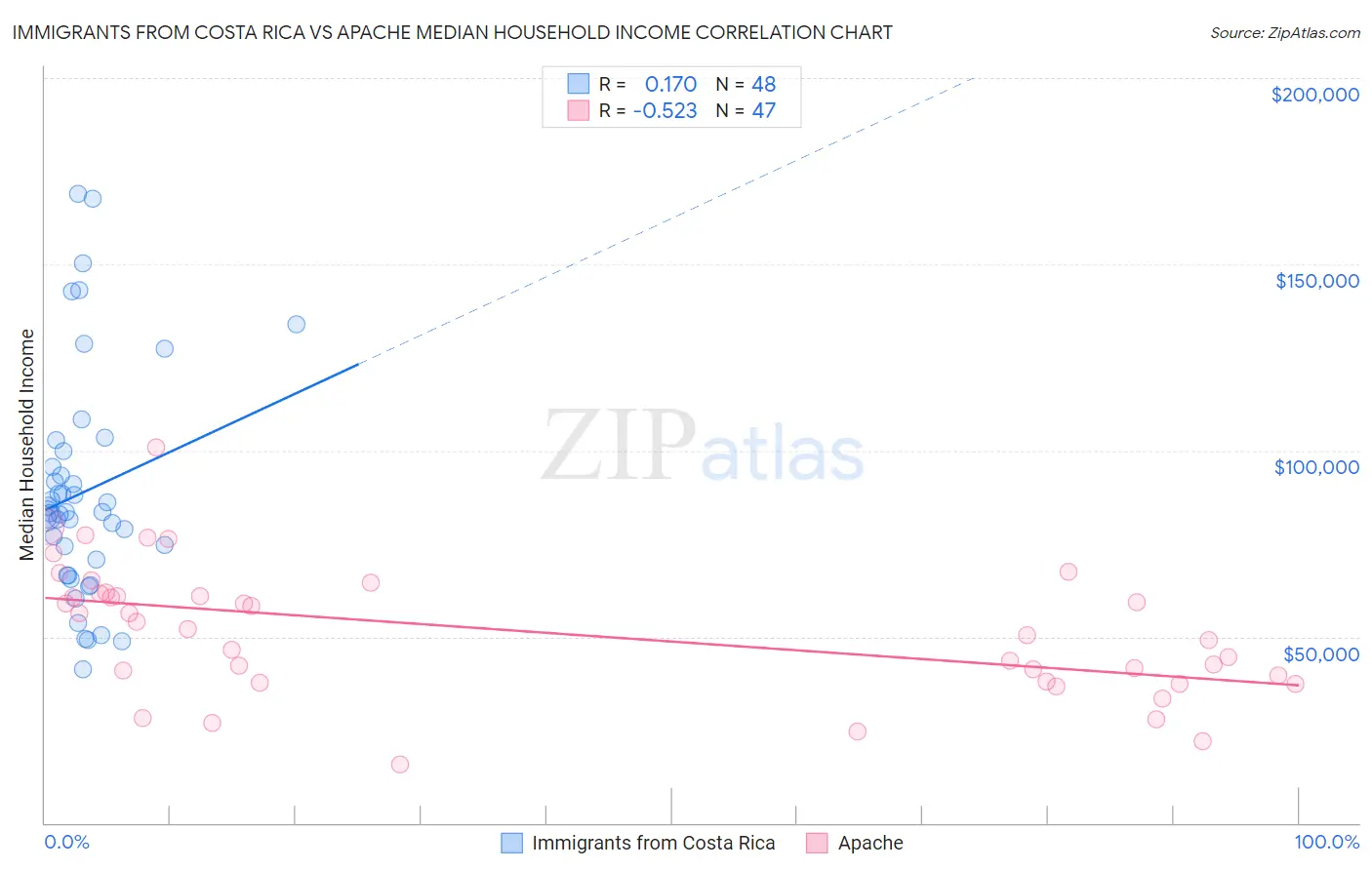 Immigrants from Costa Rica vs Apache Median Household Income Correlation Chart