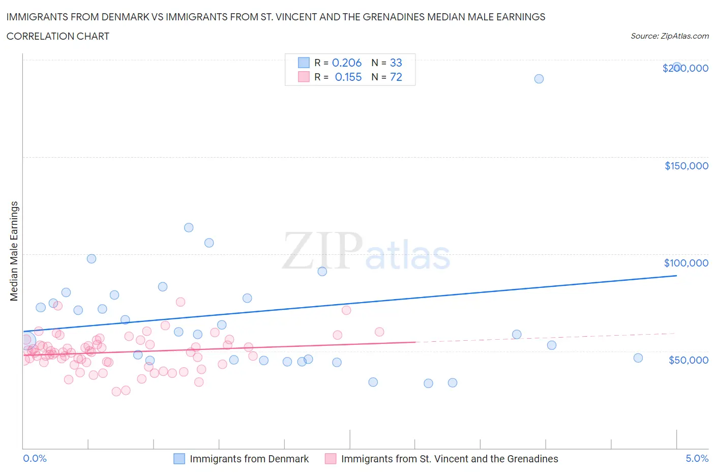 Immigrants from Denmark vs Immigrants from St. Vincent and the Grenadines Median Male Earnings Correlation Chart